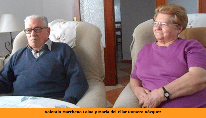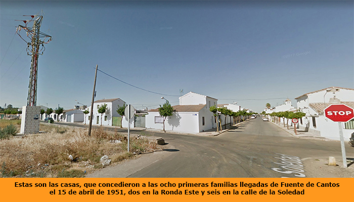 Nos dice Valentín Marchena Laina que está sentado en su casa junto a su esposa María del Pilar Romero Vázquez que cuando sus padres llegaron a Guadiana del Caudillo, él se encontraba en Alcalá de Henares cumpliendo el servicio militar, por lo que los primeros colonos que llegaron un 15 de abril de 1951 (domingo) procedían de Fuente de Cantos, les dieron las casas en la misma zona y las parcelas seguidas, lotes desde el 213 al 220. Esas ocho primeras familias fueron las siguientes: