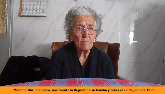 Mariana Murillo Blanco, nos cuenta que llegaron a nuestro pueblo, desde Helechosa de los Montes, un 22 de julio de 1953, ocho familias en un camión de Talavera de la Reina, dado que el camión que había en el pueblo era muy chico, nos comenta que traían cuatro trastos cada uno y en el medio de la caja del camión un hueco para meterse las personas que venían, todas las personas mayores y los hijos que traían con ellos.