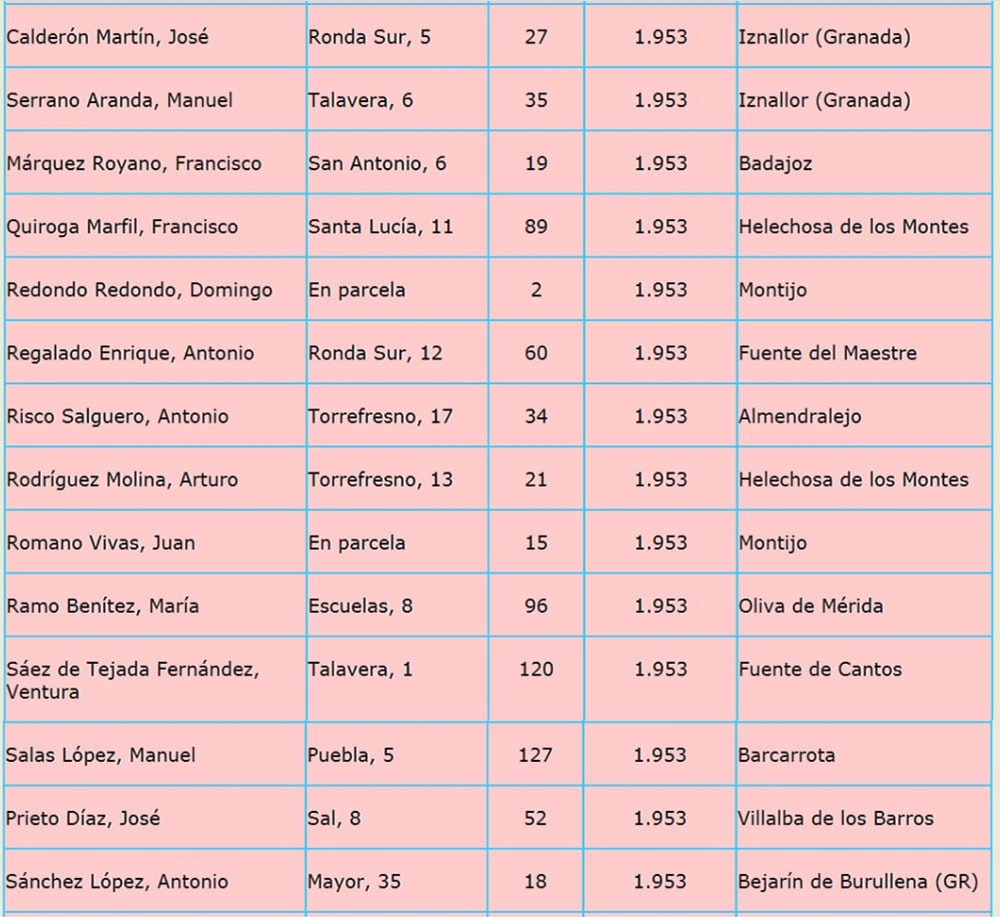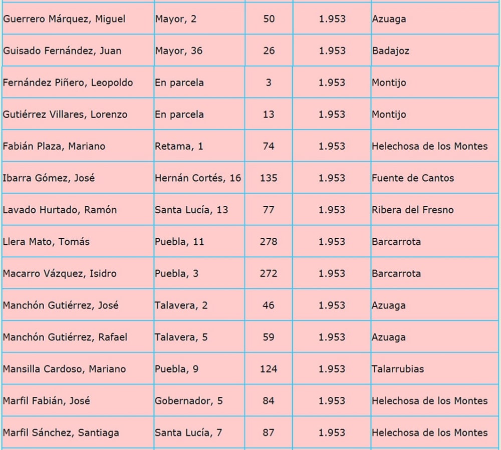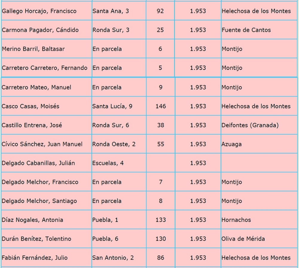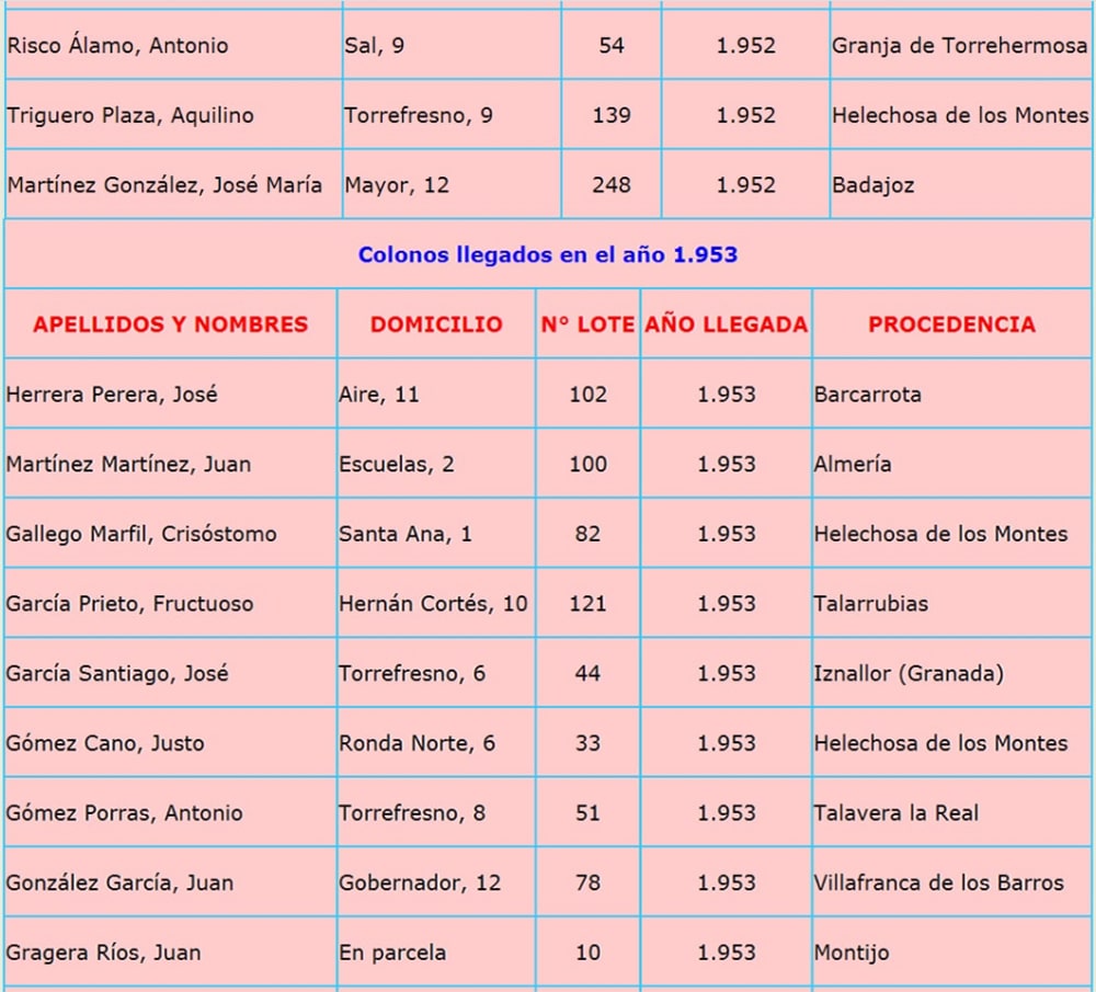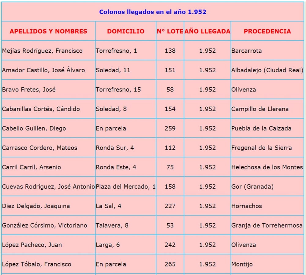 En capítulos siguientes iré poniendo año por año los listados de los 276 colonos llegados a nuestro pueblo, entre los años 1951 y 1960, estos listados me los dio en su día Julian Muñoz Marfil, (fallecido) al cual recordamos con mucho cariño, y le agradecimos su ayuda desinteresada.