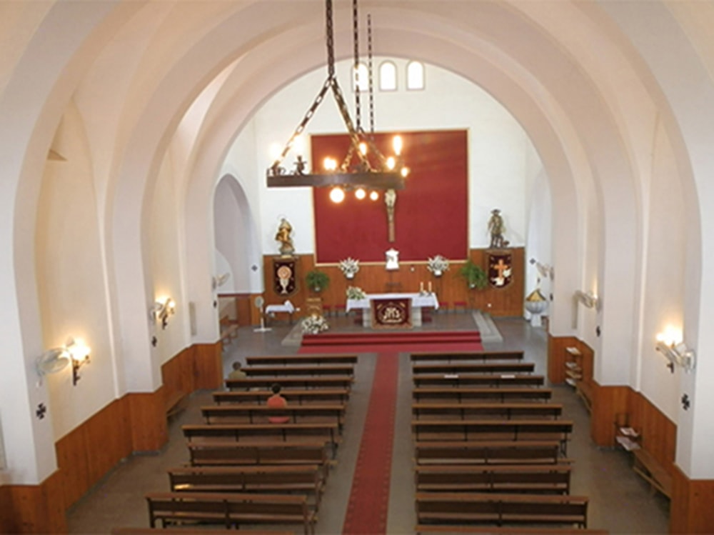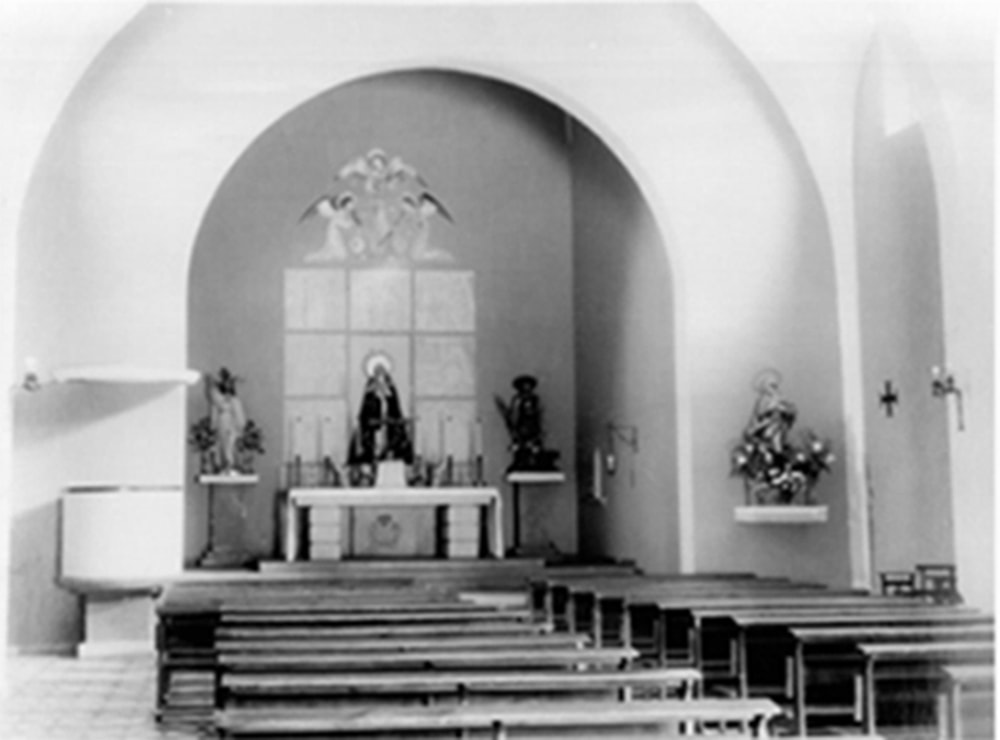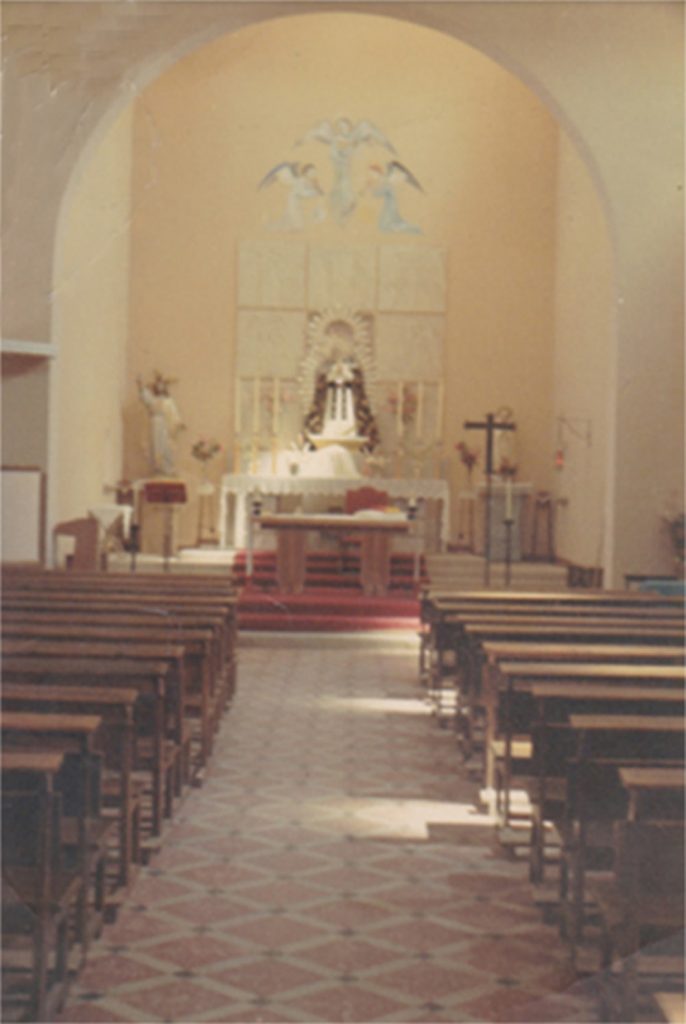 Como podéis apreciar en esta fotografía que adjunto en blanco y negro, el altar mayor estaba presidido por nuestra patrona la Virgen de la Soledad, rodeada por siete piedras cuadradas en relieve, las cuales representan los siete dolores de la Virgen y encima de dichas piedras tres ángeles pintados en la pared. Al lado derecho estaba la imagen del Sagrado Corazón de Jesús y a la izquierda la imagen de San Isidro.