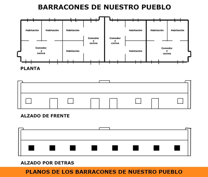 Por cada barracón de cuatro familias había otro de la misma capacidad, para meter el ganado, así como los barracones con capacidad para ocho familias, también tenían otro de la misma capacidad para el ganado. Esto lo pueden apreciar ustedes en los barracones que tenían chimeneas, que eran para vivir las personas y los barracones que no tienen chimeneas, para el ganado.