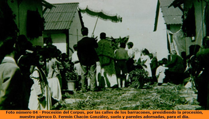 Las procesiones de nuestro pueblo pasaban por los barracones, las cuales se decoraban, al igual que se hace ahora. Las fotos siguientes podemos ver la procesión del día del Corpus, pasando por entre las calles de los barracones.