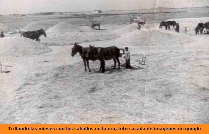 Al principio el trillar las mieses en las eras, era todo muy rudimentario, dado que como he dicho anteriormente, la cebada, avena, trigo, se había sembrado en el otoño y al llegar el verano una vez segadas las mieses están eran llevadas a las eras y se hacían las parvas = (cereal segado y extendido sobre la era para ser trillado) y después trillarlas. Estas tareas se hacían en pleno mes de agosto, cuando más calor hacía, se desataban los haces o manojos de cereales, se esparramaban = (extendían) por la era y quedaban preparados, para que con los caballos, mulas, asnos, tirando del trillo y dando vueltas sobre la parva, se iban separando el grano y lo demás se convertía en paja.
