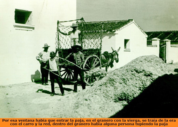 Pero lo más difícil y penoso, era llenar los carros con sus redes, de paja, transportarlas a la ventana pequeña que tenían todos los graneros, y empezar a introducir la paja por la ventana anteriormente comentada, se desataban las redes y la paja caía al suelo, para dese allí, con una vierga = (herramienta que sirva para mover la paja) se introducía por la ventana.