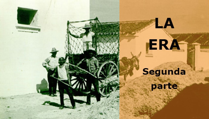 Después de esta aclaración, vamos hablar de la otra función que tenía la era de nuestro pueblo, además del fútbol. La era estaba también destinada a trillar las mieses = (cereales maduros) que se habían sembrado en las parcelas en el otoño, cebada, avena, trigo y que llegado el verano, los hombres y mujeres de Guadiana, habían segado con las hoces, habían hecho gavillas = (haces o manojos de trigo, cebada, etc.) las cuales se ataban, según se iban segando y transportaban en carros hasta la era.