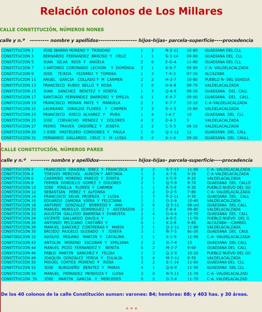 En esta tercera y última parte dedicada a las parcelas de los cerros, en la que se iba a construir el pueblo de los Millares, Juan Domínguez Núñez, me dio en el año 2012 toda la relación de los colonos por calles, por nombre y apellidos, el nombre de sus señoras, sus hijos e hijas, parcela, superficie de la misma y la procedencia de cada uno de los colonos.