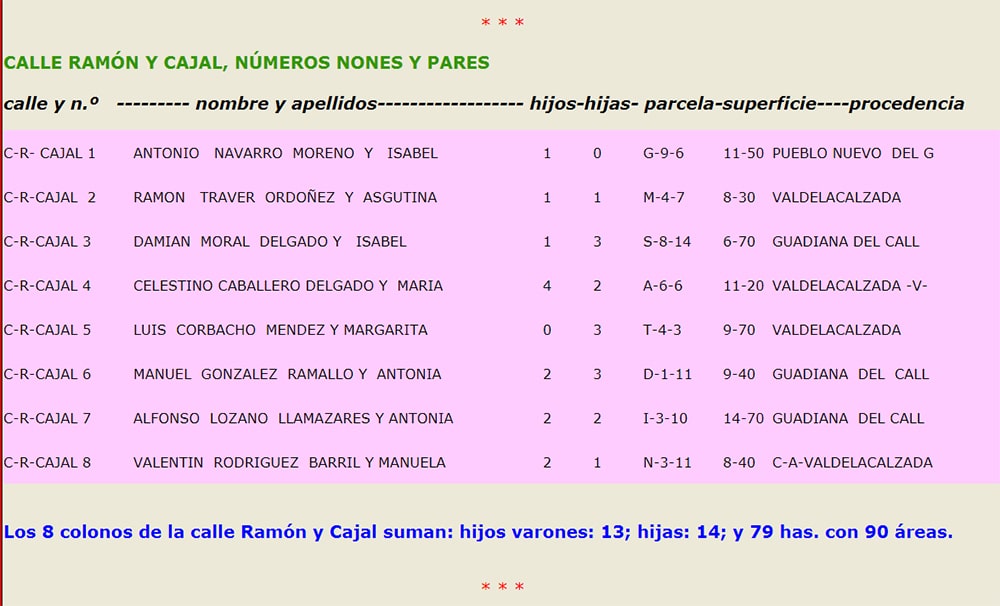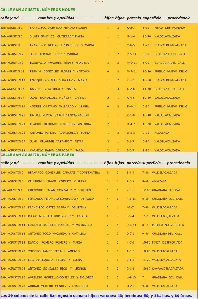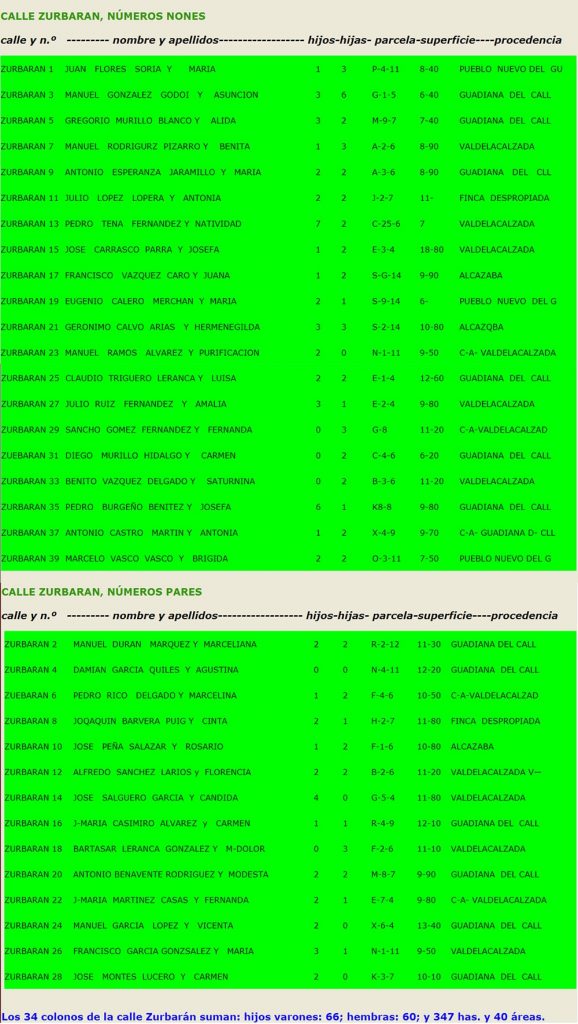 Hijos de colonos de Valdelacalzada………………………………………………………… 31