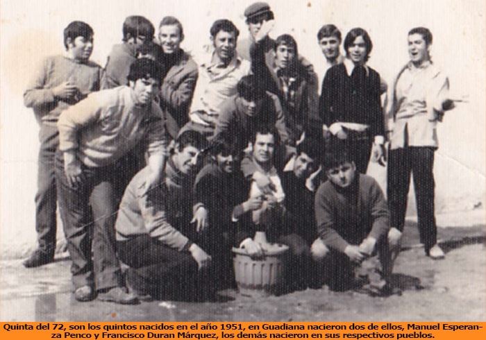 De todas las quintas que ha tenido Guadiana durante esos años, me voy a ceñir solo a una “la quinta del 72” y esto ¿Por qué?, pues muy sencillo, porque los dos primeros niños que nacieron en Guadiana y se bautizaron en la iglesia de la Soledad, fueron en primer lugar Manuel Esperanza Penco, que nació en nuestro pueblo el 27 de mayo de 1951 y fue bautizado el 12 de agosto del mismo año. Y en segundo lugar Francisco Durán Márquez, que nació el 5 de noviembre de 1951 y bautizado el 25 del mismo mes.