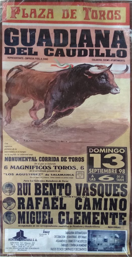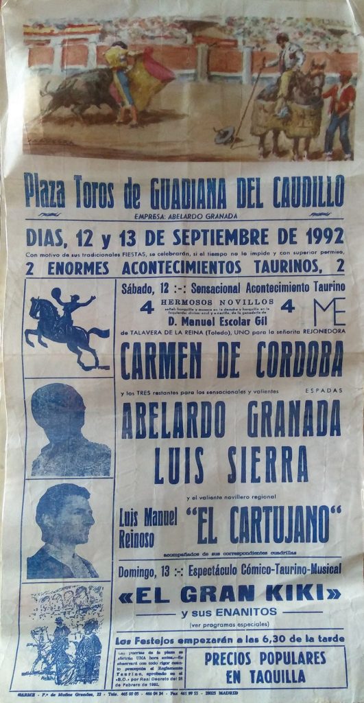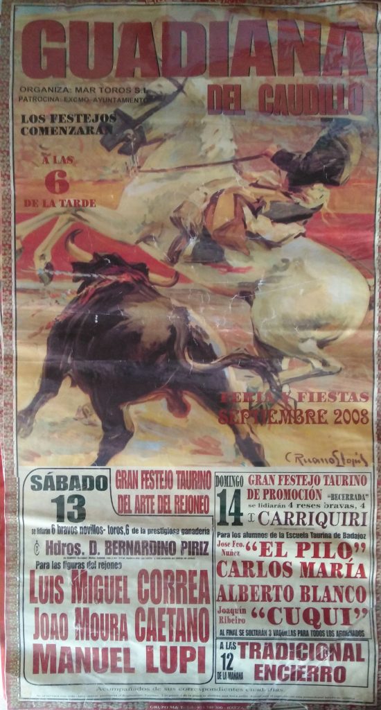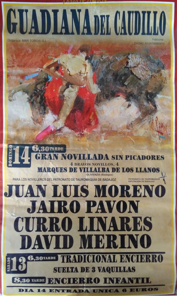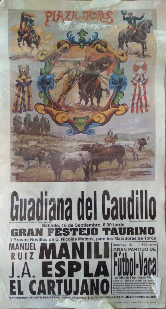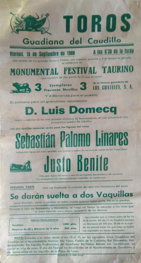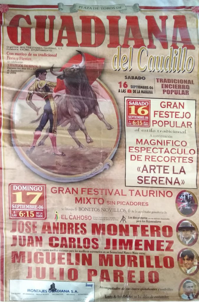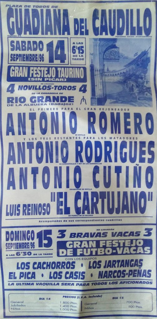 Como ustedes bien saben las primeras corridas celebradas en nuestro pueblo eran plazas de carros, remolques etc. pero ya más adelante en años posteriores, se han traído plazas portátiles a Guadiana y se hacían carteles sobre el festejo que se celebraba cada año.