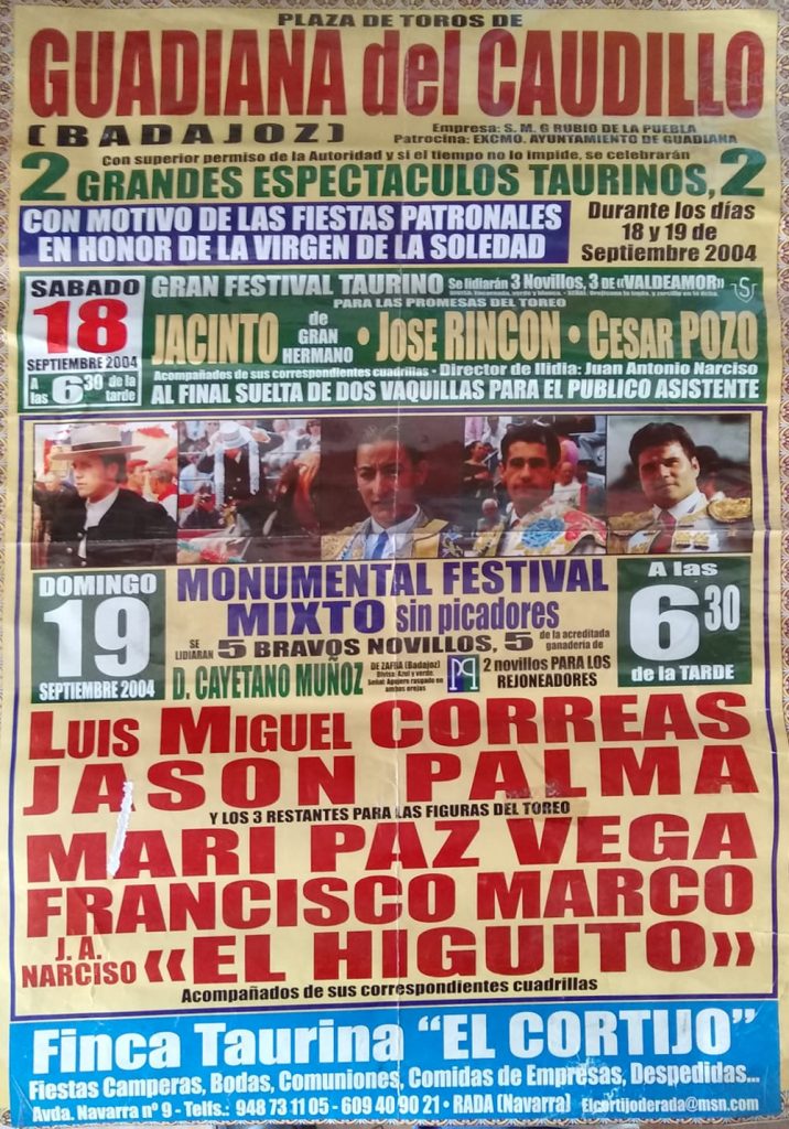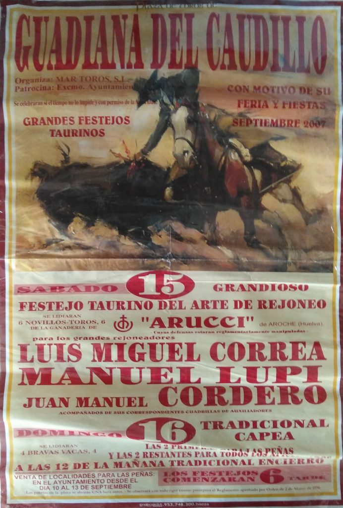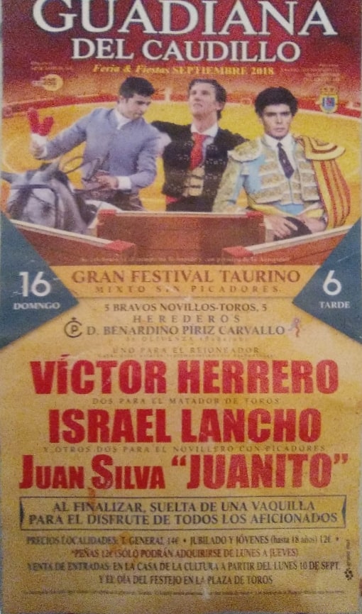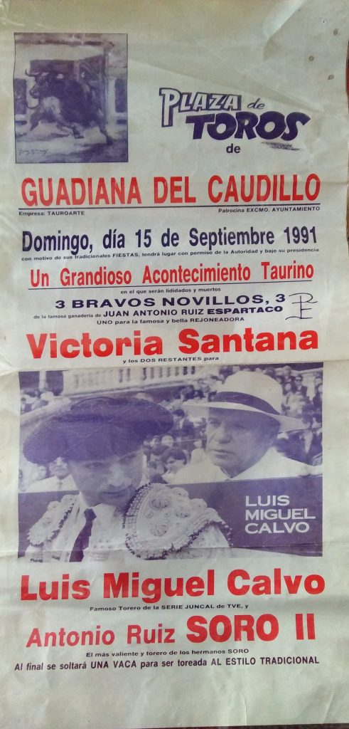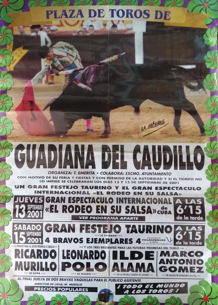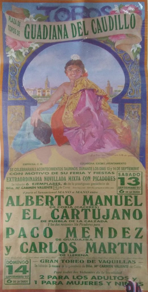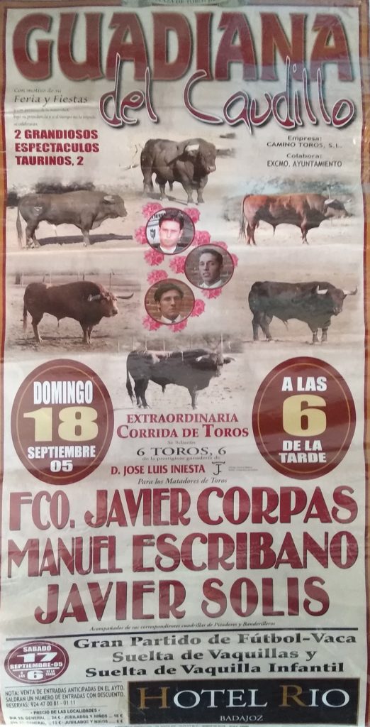 Como ustedes bien saben las primeras corridas celebradas en nuestro pueblo eran plazas de carros, remolques etc. pero ya más adelante en años posteriores, se han traído plazas portátiles a Guadiana y se hacían carteles sobre el festejo que se celebraba cada año.